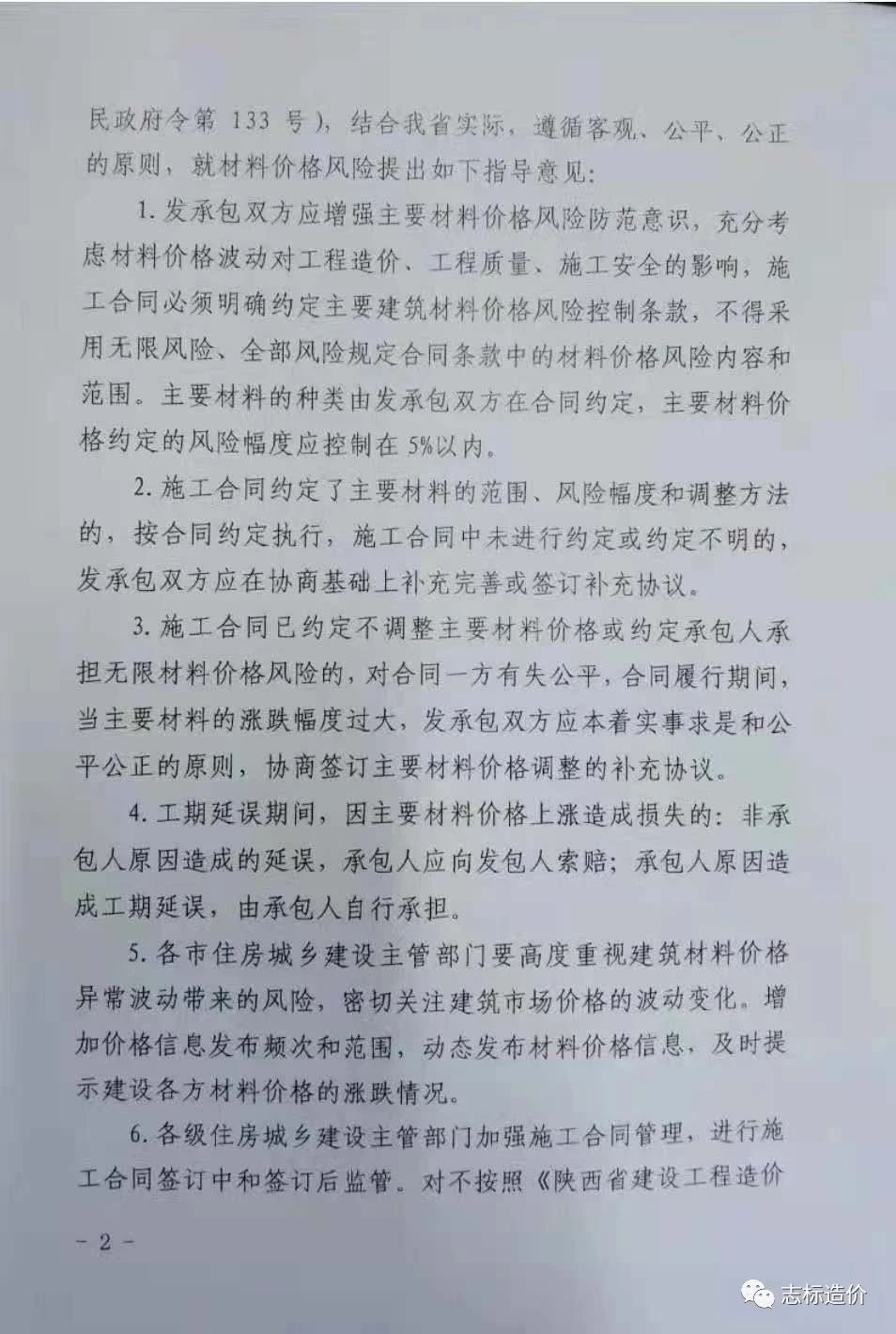 1、發承包雙方應增強主要材料價格風險防范意識,充分考慮材料價格波動對工程造價、工程質量、施工安全的影響,施工合同必須明確約定主要建筑材料價格風險控制條款,不得采用無限風險,全部風險規定合同條款中的材料價格風險內容和范圍,主要材料的種類由發承包雙方在合同中約定,主要材料價格約定的風險幅度應控制在5%以內。這條和陜西省建設廳2009年頒布的陜建發【2009】3號文件的內容相似,卻又不同。